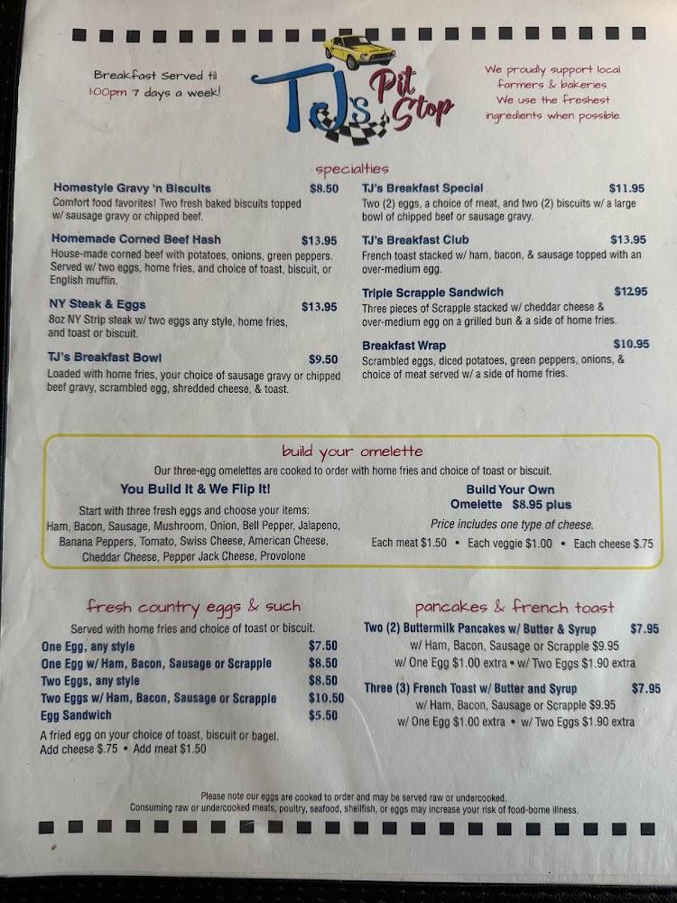 The menu at TJ's Pit Stop is a delightful blend of classic American cuisine, featuring everything from hearty breakfasts to satisfying dinners. Signature dishes include the homemade corned beef hash and tender country fried steak, perfect for comfort seekers.